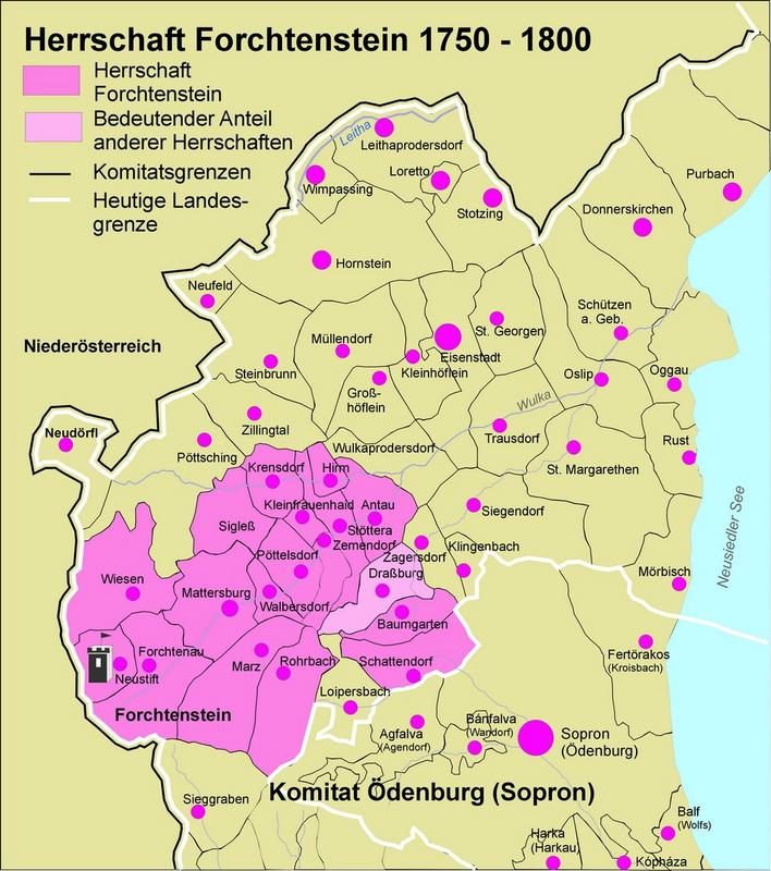 1738 wurden die Herrschaften Forchtenstein und Eisenstadt neu organisiert. Breitenbrunn, Großhöflein, der Anteil in Trausdorf und Wulkaprodersdorf kamen an Eisenstadt, Rohrbach und die Besitzanteile in Antau, Zemendorf und Marz an Forchtenstein, Müllendorf von der Herrschaft Forchtenstein an Hornstein, Pöttelsdorf von Hornstein an Forchtenstein. Baumgarten kam von der Herrschaft Lackenbach an Forchtenstein. 1740 dürfte Sieggraben an Kobersdorf gekommen sein.