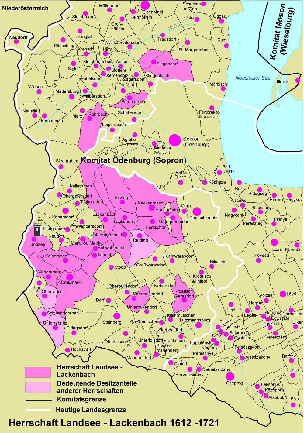 Zur Zeit des Übergangs an die Esterházy gehörten folgende Orte zur Herrschaft: Baumgarten, Draßmarkt, Horitschon, Kaisersdorf, Kroatisch Gerersdorf, Lackenbach, Lackendorf, Landsee mit Blumau, Markt St. Martin, Mitterpullendorf, Neckenmarkt, Neutal, Teile von Oberrabnitz, Teile von Raiding, Ritzing, Rohrbach, Schwendgraben (teilweise), Siegendorf, Unterrabnitz (teilweise), Unterfrauenhaid, Unterpetersdorf und Weingraben. Zur Herrschaft gehörte auch Samersdorf zwischen Haschendorf und Neckenmarkt, ein Weiler mit einem Kastell. Samersdorf war über längere Zeit verpfändet und wurde erst wieder 1749 der Herrschaft eingegliedert. 1721 wurde Kroatisch Gerersdorf der Herrschaft Deutschkreutz zugeteilt. Im gleichen Jahr wurden auch Siegendorf und Rohrbach von der Herrschaft getrennt. Beide kamen zur Herrschaft Eisenstadt, Rohrbach später zu Forchtenstein. Baumgarten wurde 1738 formell der Herrschaft Forchtenstein angeschlossen, aber erst 1772 tatsächlich einverleibt, da der Ort über lange Zeit verpfändet war. Zum Gut Samersdorf wurde der Ort Haschendorf geschlagen, den die Fürstin Maria Oktavia 1733 von den Erben des Georg Madarasz eingelöst hatte. 1749 löste Fürst Paul II. Anton diese Besitzung von seiner Mutter zurück und unterstellte sie der Herrschaft Landsee- Lackenbach. Zuvor hatte Haschendorf zu Forchtenstein gehört. Seit Beginn des 18. Jahrhunderts wird die Herrschaft meist nur mehr als "Herrschaft Lackenbach" bezeichnet. 1801 wurden Schwendgraben und Unterrabnitz zur Herrschaft Lockenhaus geschlagen.