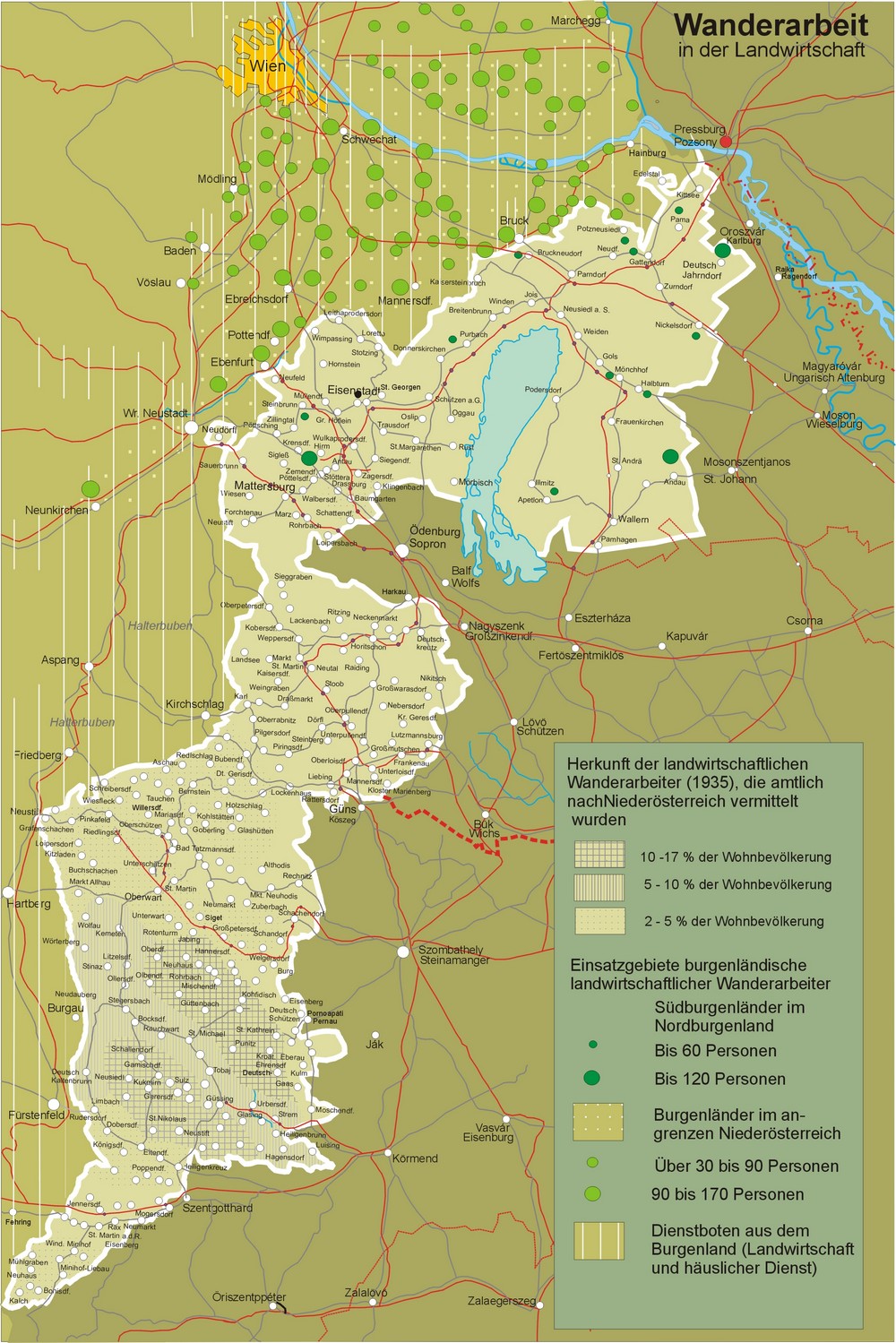 Die meisten landwirtschaftlichen Saisonarbeiter kamen aus dem Güssinger Bezirk. Hier waren zeitweise nahezu 30 % der arbeitsfähigen Bevölkerung als Saisonarbeiter tätig. Auch der Oberwarter Raum war ein wichtiges Herkunftsgebiet der Saisonarbeiter. In der Zwischenkriegszeit gingen viele Gutsbetriebe dazu über, billigere Arbeitskräfte aus der Slowakei anzustellen. Diese verdrängten die burgenländischen Saisonarbeiter. Erst in der Weltwirtschaftskrise, mit steigender Arbeitslosigkeit, wurden die ausländischen Arbeitskräfte durch Burgenländer, die von den Arbeitsämtern vermittelt wurden, ersetzt. Vereinzelt gab es auch noch nach dem zweiten Weltkrieg landwirtschaftliche Saisonarbeit, die aber mit der Mechanisierung der Landwirtschaft verschwand. Die zunehmend bessere Verkehrserschließung machte die besser bezahlte Arbeit als Pendler in Gewerbe und Industrie attraktiver.