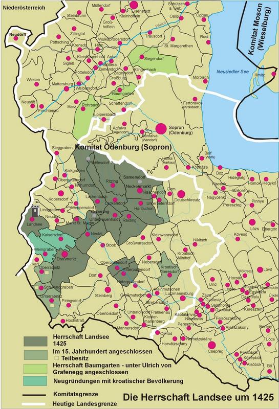 Zur Herrschaft Landsee gehörten im Jahre 1425 die Märkte Neckenmarkt und Landsee, die Dörfer Draßmarkt, Ober- und Mitterpullendorf, Raiding, Neutal, St. Martin, Lackenbach, Szergeny (bei Kapuvár), Lackendorf, Horitschon, Ritzing, Samersdorf (bei Neckenmarkt), die Wüstungen Urkund (am Neusiedlersee), Pichlesdorff (im Grenzbereich von Lackenbach-Lackendorf-Ödenburg), Unterfrauenhaid, Gorbonuk (Gaberling, zwischen St. Martin und Lackenbach). In späterer Zeit gingen Urkon und Szergeny verloren, hinzu kamen noch im 15, Jahrhundert Baumgarten, Siegendorf, Rohrbach, Unterpetersdorf, Geresdorf, später auch Teile von Ober- und Unterrabnitz und Schwendgraben. Kroatische Neusiedlungen waren Weingraben und Kaisersdorf, Unterfrauenhaid wurde neu besiedelt, ebenso der Markt Landsee am Fuße der Burg. (zitiert nach: Prickler, Harald: Burgen und Schlösser im Burgenland, S,87f.)