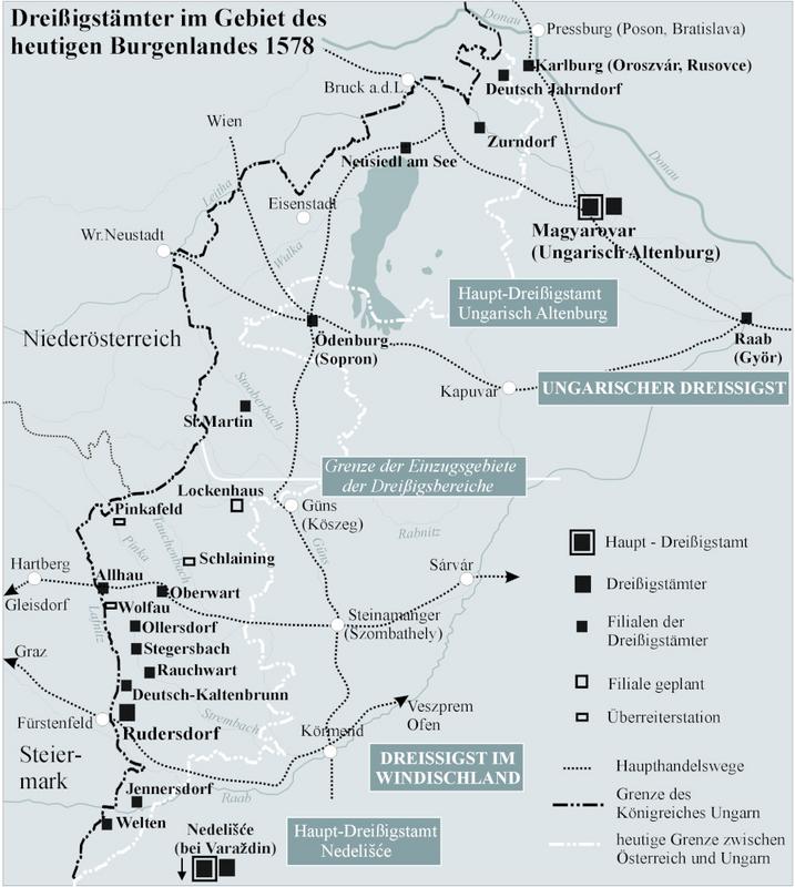 Südlich der Donau hatte sich Ungarisch Altenburg zum Hauptdreißigstamt bis in die Gegend von Güns entwickelt. Ihm unterstanden die Dreißigstämter Deutsch Jahrndorf, Karlburg, Raab, Zurndorf, Neusiedl am See, Ödenburg, St. Martin. Früher waren Rust, Mörbisch und Kroisbach Filialen von Ödenburg. Der Dreißigst im Windischland begann bei Pinkafeld. Rudersdorf war ein Nebendreißigstamt, zu dem die Filialen Oberwart, Allhau, Deutsch Kaltenbrunn, Stegersbach, Ollersdorf, Rauchwart, Welten, Jennersdorf und Henndorf gehören.