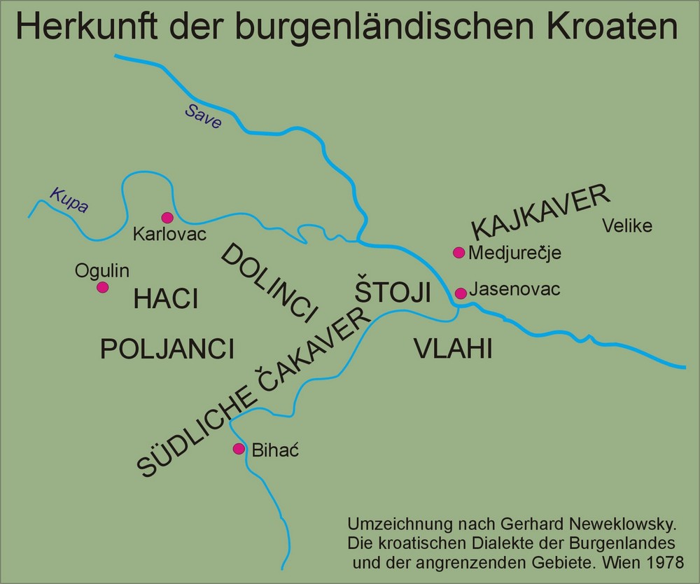 Nach Neweklowsky besiedelten die Nádasdy Kohlnhof (Kópháza), Hidegség und Fertöhomok mit Kroaten, die Batthyány brachten Bauern aus dem Gebiet von Koprivnica, aus der Gegend zwischen Papuk, Psunj und Stupcanica in das südliche Burgenland, die Erdödy aus der Moslavina und Nordslawonien in ihre Herrschaft Rottenturm. 1556 fiel die Festung Kostajnica und die Türken eroberten die Gebiete zwischen Una und Kupa. Die Zrinski besaßen Güter zwischen Kostajnica und Hrastovnica. Von dort übersiedelten sie 1556 bis 1561 Bauern ins Pinkatal (Eberau, Rotenturm, Weppendorf/Vép) und auch ins mittlere Burgenland. Von 1565 bis 1579 erfolgte die Abwanderung von Kladusa bis Stenicnjak, von Slunj bis Primislje und von Krstinja in das nördliche und mittlere Burgenland, in die Umgebung von Wien und auf die Güter der Grafen Illyésházy um Pressburg. Die Wanderungen endeten Ende des 16. Jahrhunderts, ab 1577 erfolgte bereits teilweise eine Rückwanderung aus Niederösterreich.