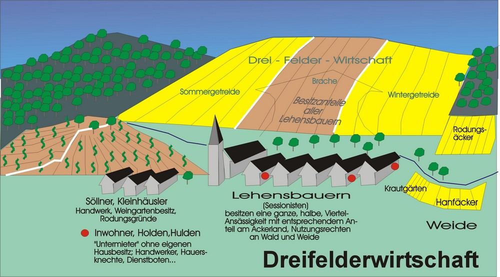 Die zu einem bäuerlichen Hof gehörenden Ackergründe lagen in drei „Feldern“, wobei jeder Bauer in jedem „Feld“ (Gewann) einen Acker hatte. Die drei Felder wurden in dreijährigem Wechsel mit Sommergetreide und Wintergetreide bestellt und im dritten Jahr brachliegen gelassen, wobei die Brache als Weide diente und auch mit Mist versehen wurde. Diese Dreifelderwirtschaft herrschte bis in das 19. Jahrhundert in den meisten Dörfern vor.