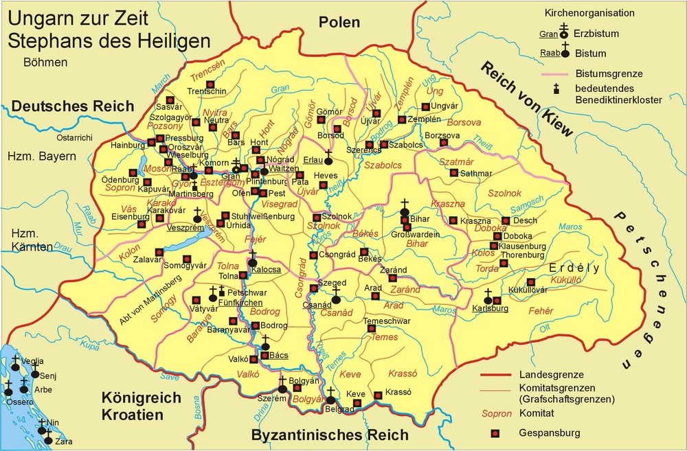 Interessant ist, dass die neue weltliche Gebietsorganisation der Gespanschaften und Komitate und die kirchliche Organisation weitgehend übereinstimmten. Sie entstanden ja etwa zur gleichen Zeit. Die Dekanatskirchen befanden sich in den Komitatsburgen, die Dekanatsbezirke deckten sich weitgehend mit den Komitaten.