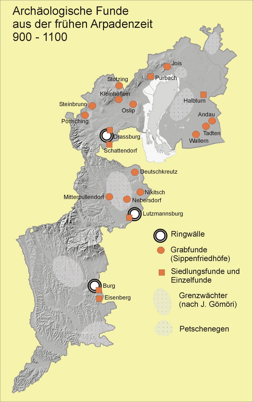 Die außerhalb des magyarischen Siedlungsgebietes gelegenen Grenzwächtersiedlungen lagen an besonders gefährdeten Stellen. Die in den ungarischen Ortsbezeichnungen vorkommenden Namenselemente wie Ör (Wächter) Lövö (Schützen), Lö sowie Szem (Auge) weisen auf diese Funktion hin. Grenzwächter (lateinisch Speculatores) finden wir z. B. in der "Wart" (Oberwart, Unterwart, Siget in der Wart) Kleinjabing, Koh- und Kirchfidisch, in Ober- Mitter- und Unterpullendorf. An der Leitha und um den Neusiedler See wurden Petschenegen (Bissener) als Grenzwächter angesiedelt, ebenso zwischen Leitha und Donau. Grenzwächtersiedlungen gab es in Pöttsching, Leithaprodersdorf, Gattendorf, Jois, Mönchhof und Bezenye/Pallersdorf. Die Ortsnamen Pöttsching und Bezenye (nordöstlich des Grenzüberganges Nickelsdorf) deuten auf die Ansiedlung von Petschenegen (Bissener) hin. Auch der Riedname Pöttschen in Kittsee, direkt an der Donau, könnte darauf zurückzuführen sein. Die Petschenegen sperrten also die Ödenburger und die Brucker Pforte gegen Westen ab. "Russen", eigentlich germanische Waräger, sicherten die Hainburger Pforte, wie auch aus dem Ortsnamen Oroszvar (= Russenburg) hervorgeht. Die Grenzwächter mussten das Herannahen eines Feindes melden und die Truppen in kleine Gefechte verwickeln, um Zeit zu gewinnen, bis sich das ungarische Heer zum Kampf bereitgemacht hatte.