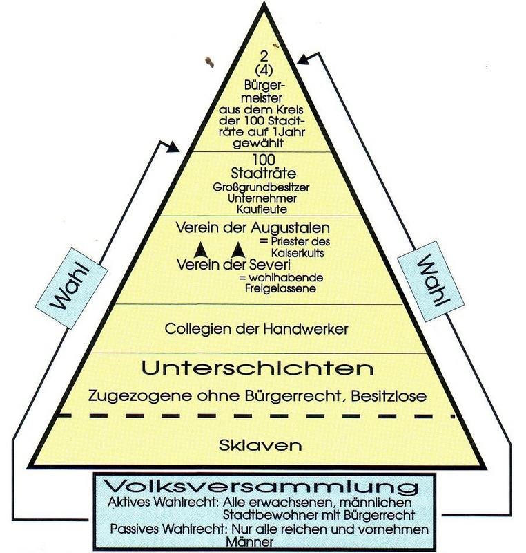 Das größte Ansehen in der städtischen Bevölkerung genossen die Gutsbesitzer. Es waren anfangs Angehörige der frei geborenen örtlichen Aristokratie und derjenigen Veteranen, die als Abfindung Grund und Boden bekommen hatten. Später waren es Kaufleute, Unternehmer und Staatsbeamte, die mit ihrem Geld Großgrundbesitz in der Umgebung der Stadt erwarben. An zweiter Stelle in der Rangordnung der städtischen Gesellschaft stand der Verein der Augustalen (=Priester des Kaiserkults) und der severi (freigelassene Sklaven). Freigelassene erwirtschafteten sich oft ein großes Vermögen. Da das städtische Gemeinwesen das Geld der Freigelassenen auf jede Weise nutzen wollte, wurden diese in die Körperschaft der Augustalen gewählt Freigelassene durften aufgrund ihrer Abstammung nicht in den Stadtrat gewählt werden. Allerdings konnte der Sohn eines reichen Freigelassenen, wenn er sein Geld auch zum Wohle einer Stadt verwendete, in den Stadtrat gewählt werden.