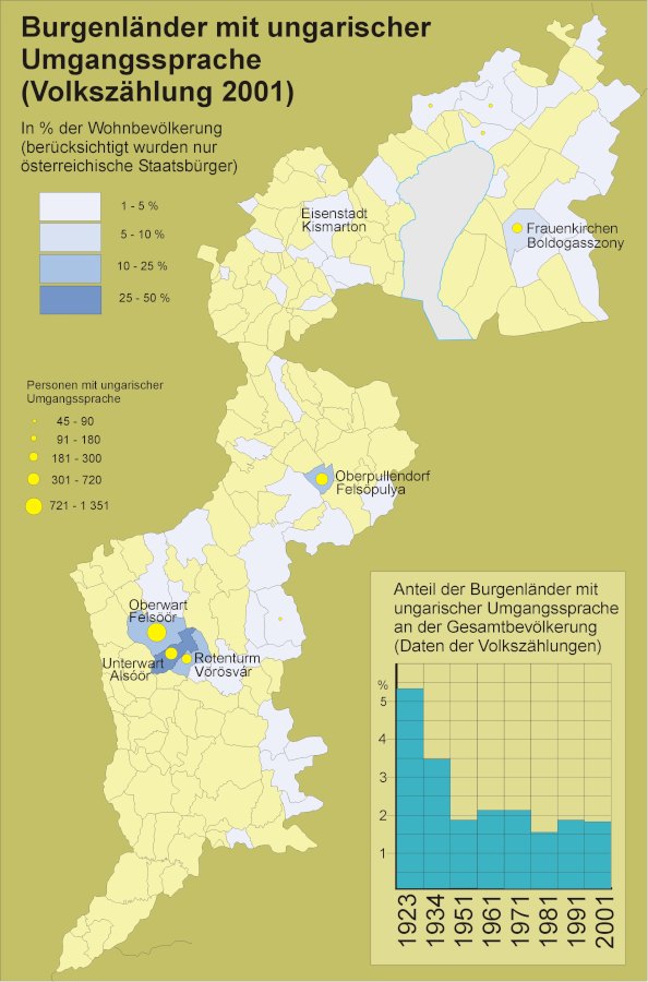 Nach dem Anschluss des Landes an Österreich wurden die auf burgenländischem Gebiet lebenden Madjaren zu einer Minderheit. Im ungarischen Staatsdienst arbeitende Beamte verloren ihren Arbeitsplatz und zogen nach Ungarn. 1920 betrug die Zahl der Madjaren noch 24.899, 1923 nur noch 15.224 Personen. Es waren dies die in den Sprachinseln von Oberwart und Oberpullendorf lebenden Madjaren, ungarische Arbeiter auf den Meierhöfen und Angestellte in den Gutsverwaltungen.